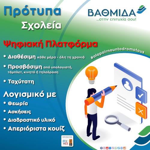 Το φροντιστήριο ΒΑΘΜΙΔΑ αναλαμβάνει την προετοιμασία των μαθητών της Ε’ & ΣΤ’ Δημοτικού για την εισαγωγή τους στα Πρότυπα Γυμνάσια καθώς και τις εξετάσεις για τις Υποτροφίες των Ιδιωτικών Γυμνασίων.
